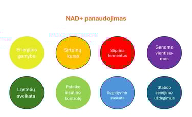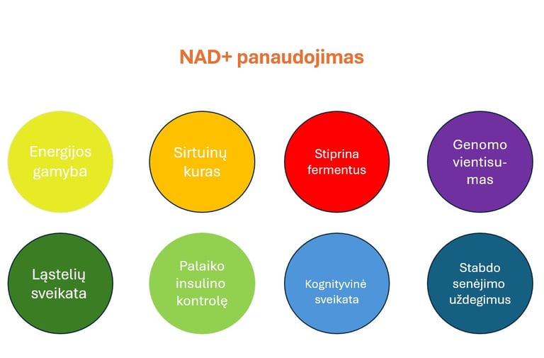 NAD+ pastaruoju metu sulaukia daug dėmesio. Daugelis mokslininkų kelia hipotezę, kad su amžiumi susijęs NAD+ sumažėjimas yra organų nykimo, būdingo senėjimui, pagrindas. Iš to išplaukia, kad atkūrus NAD+ lygį, mes tampame sveikesni, nes sveikesni tampa mūsų ląstelės ir organai. Tyrimai rodo, kad NAD+ lygio padidėjimas daro teigiamą poveikį medžiagų apykaitai (pvz., mažina nutukimą), su amžiumi susijusioms ligoms (diabetas, širdies-kraujagyslių ligos, neurodegeneracija), imuninės sistemos palaikymui senstant. Nustatyta, NAD+ veikia senėjimo žymenis (biomarkers). Kaip antai, NAD+ lygio padidėjimas suaktyvina sirtuinus ir padeda jiems išlaikyti genomo vientisumą bei skatinti DNR taisymą. Didesnis sirtuinų aktyvumas koreliuoja su ilgesne gyvenimo trukme. Naujausi tyrimai parodė, kad NAD+ lygis labai svarbus reguliuojant uždegimus ir ląstelių išlikimą imuninio atsako bei senėjimo metu.