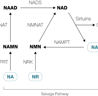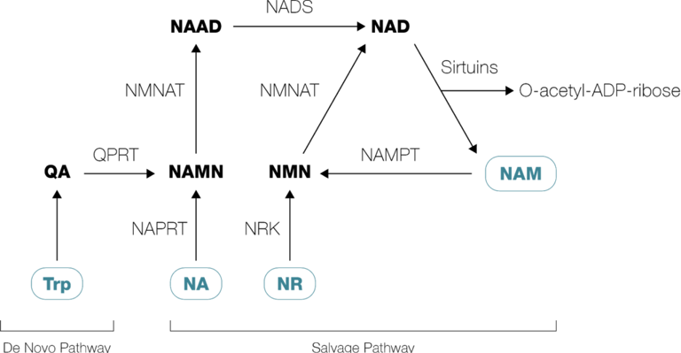 Kaip galime atkurti savo NAD+ lygį? Papildomai vartojant biocheminius komponentus - NAD pirmtakus. Problema ta, kad NAD+ molėkulė biologiškai neįsisavinama tiesiai patekusi į kūną. Laimei, mūsų ląstelės pačios gali generuoti NAD+ molėkules, tačiau joms reikalingi biocheminiai komponentai - NAD+ pirmtakai. Jie ir biosintezė padidins NAD+ lygį. NAD+ biosintezėje dalyvauja natūralūs junginiai, susiję su vitaminu B3:
