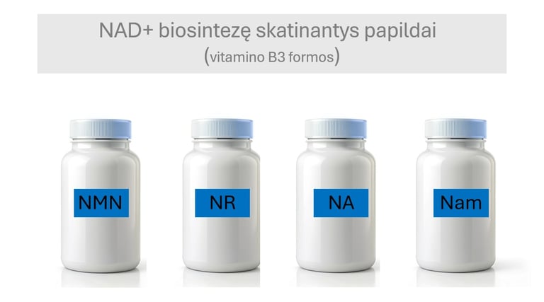 NAD+ pirmtakai. Šiuose papilduose yra junginių, kuriuos organizmas gali paversti NAD+. Pavyzdžiui, NMN ir NR. Pirmtakai suteikia statybinius blokus NAD+ sitezei ir gerai toleruojami.